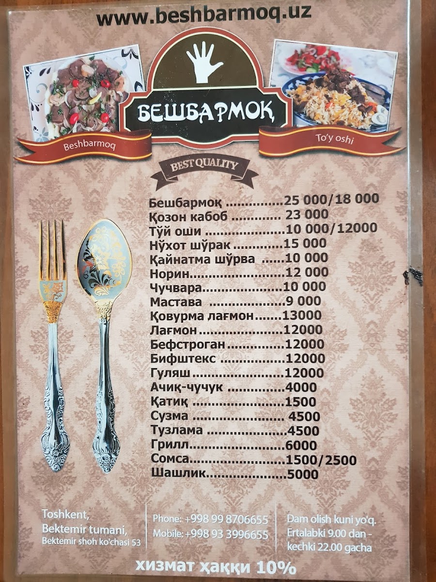 Welcome to Beshbarmoq (Abu Muslim), a charming cafe tucked away in the heart of Tashkent, Uzbekistan. Renowned for its authentic offerings, this delightful eatery specializes in traditional Uzbek cuisine, particularly the iconic beshbarmak, which customers rave about for its rich flavors and generous portions.